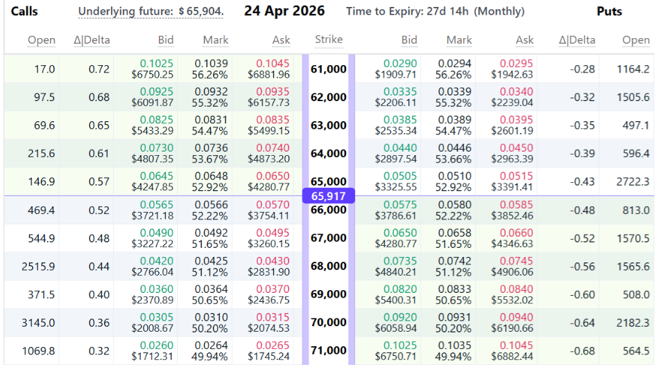 Under normal circumstances, this figure sits between -6% and 6%. Based on data from derivatives platform Deribit, put options – bets that the price will fall – for the April 24 contract at the $66,000 strike were trading at 0.0580 BTC, or about $3,786.